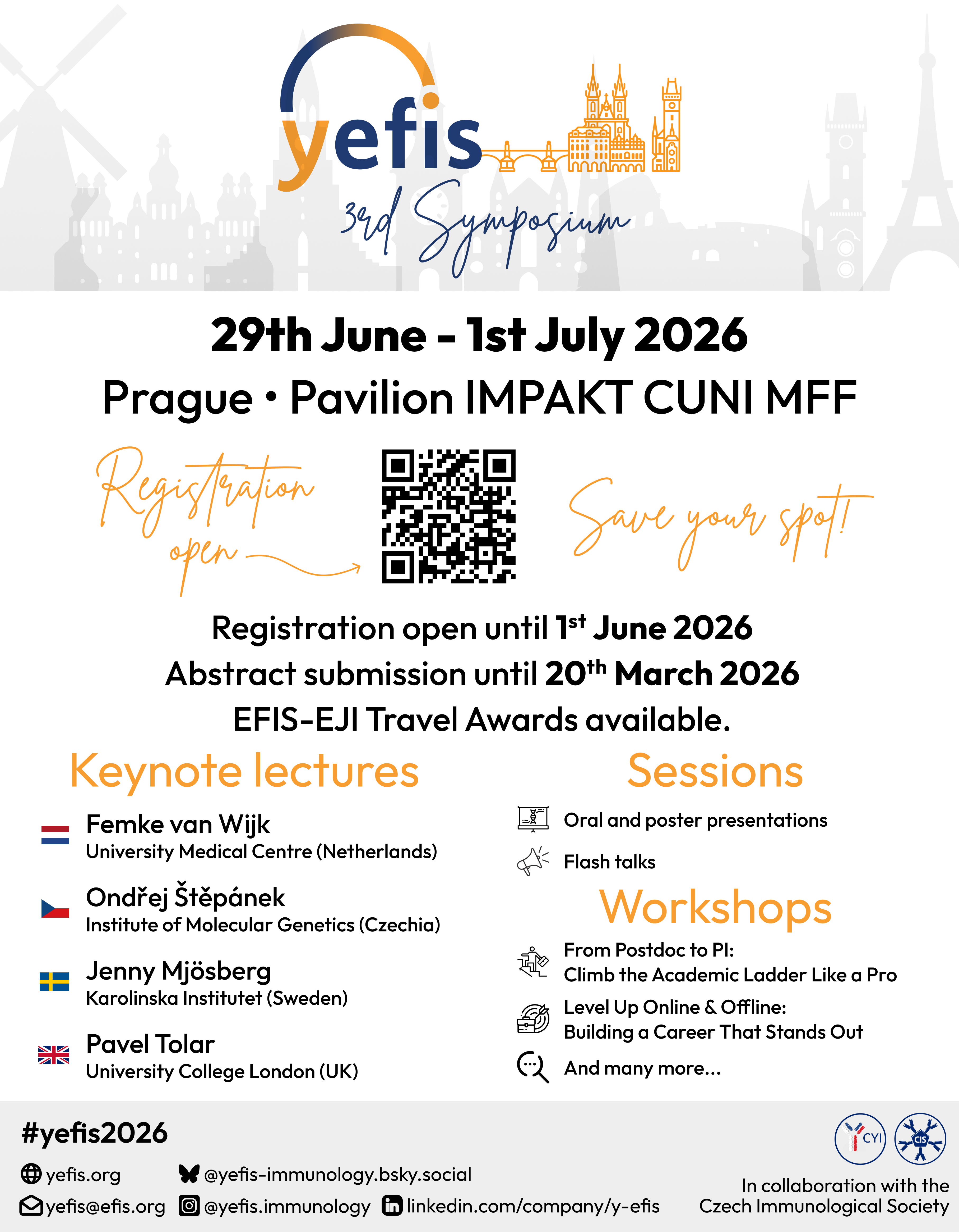 Sympozium yEFIS je připravován v úzké spolupráci s Českými mladými imunology (CYI) a Českou imunologickou společností (CIS), což z něj činí dosud největší mezinárodní imunologickou akci spolupořádanou CYI. Sympozium svede dohromady doktorandy, postdoktorandské výzkumníky a vedoucí skupin na začátku kariéry z celé Evropy. Letošní sympozium přivítá přibližně 250 výzkumníků na začátku své kariéry.